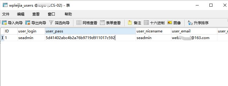 在數據表管理界面,找到 wp_users 名稱的數據表,然后編輯,進行新密碼的重置。不過通過數據庫中都是進行數據MD5加密編譯過的,可以直接把對應的 將user_pass值改成:5d41402abc4b2a76b9719d911017c592 。然后重新登錄后臺密碼是 hello